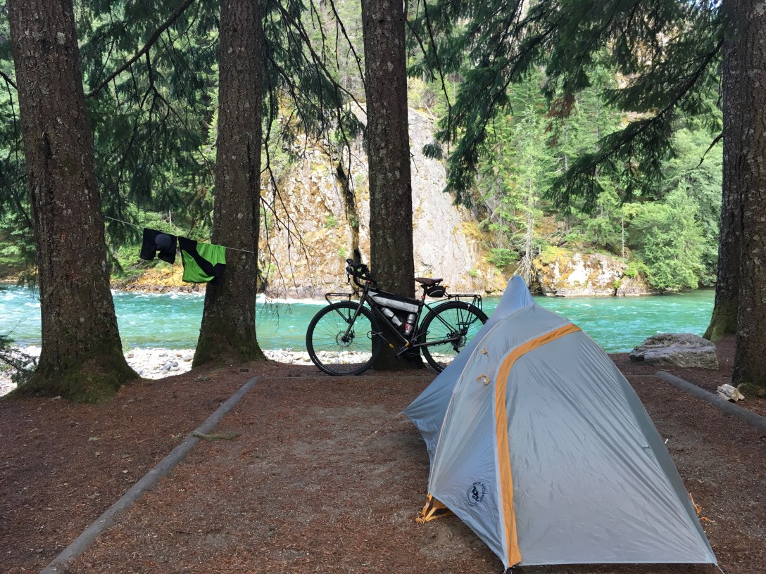 I had a great nights sleep in my one star (if you round up) motel in Concrete, WA. The clothes I handwashed the night before were not dry so I just attached them to my pannier bags and left with the laundry fluttering in the wind. I had a great french toast with blueberries breakfast and, properly fueled, left for my planned 40 mile uphill ride. About 15 minutes into the ride I noticed my front tire was almost flat! On day two! I just put air in it every hour or so and planned on fixing it when I stopped for the day. I was looking forward to stopping in a cafe in Marblemount for my mid-morning snack- I was going to get bumbleberry pie and coffee. So I was just riding along, daydreaming and looking at the scenery when I realized I hadn’t seen the cafe- it turns out I had gone 12 miles past it- darn. Then it started raining. Hard. I decided to go 7 miles farther and check out the 30th annual Cascade Learning Institute celebration. It was great- free BBQ, ice cream, music and I met some very nice people. I backtracked about two miles and pitched my tent at a primitive campground right on the Skagit river. I had just finished putting my tent up when a man from the next campsite came over to me. He said “I bet there are a lot of things you have to leave behind when you are bike touring- want to come over to my campsite for cocktails?” What a great way to end the day! By the way, my Mountain House freeze dried food is really tasty.