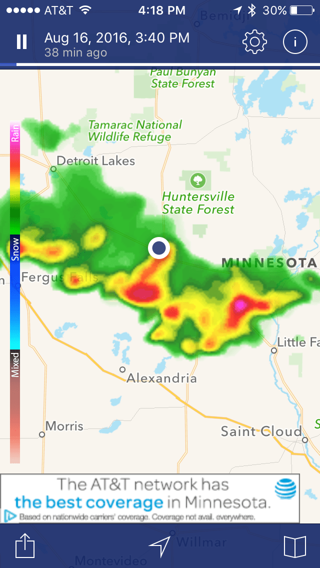 This is the front that hit right after I arrived at the hotel. I am at that dot in the middle: