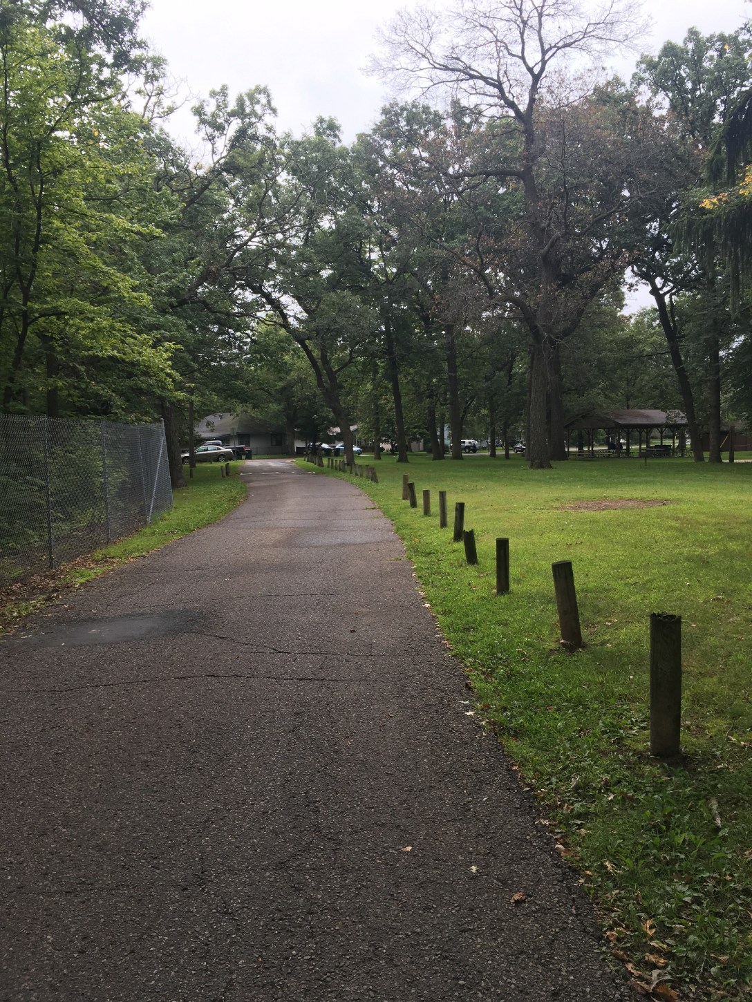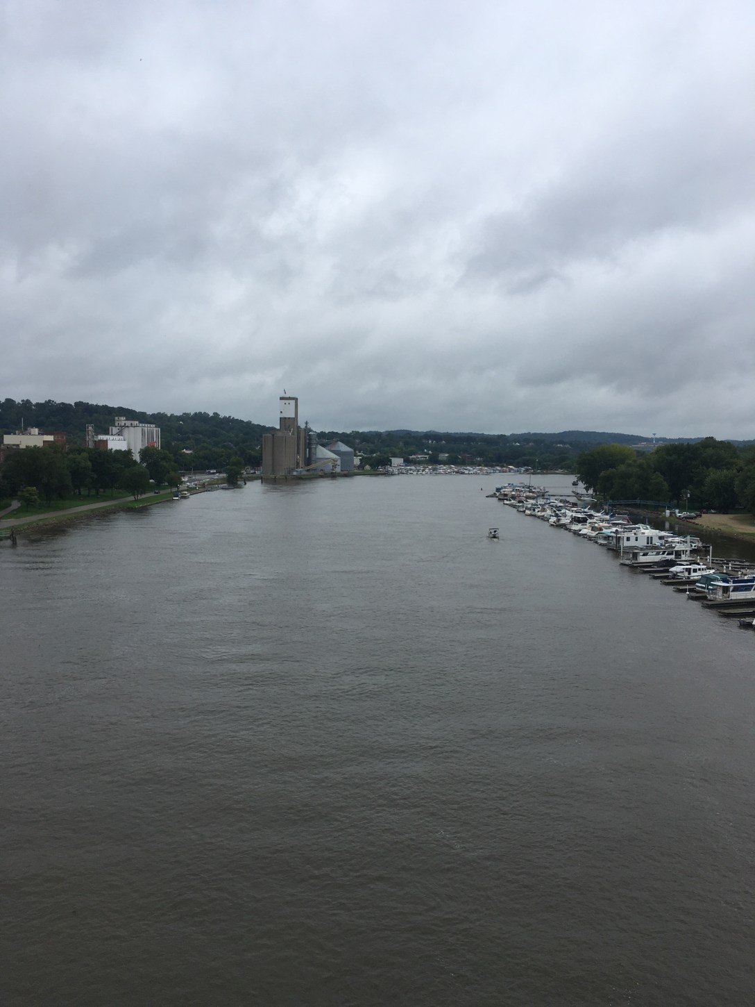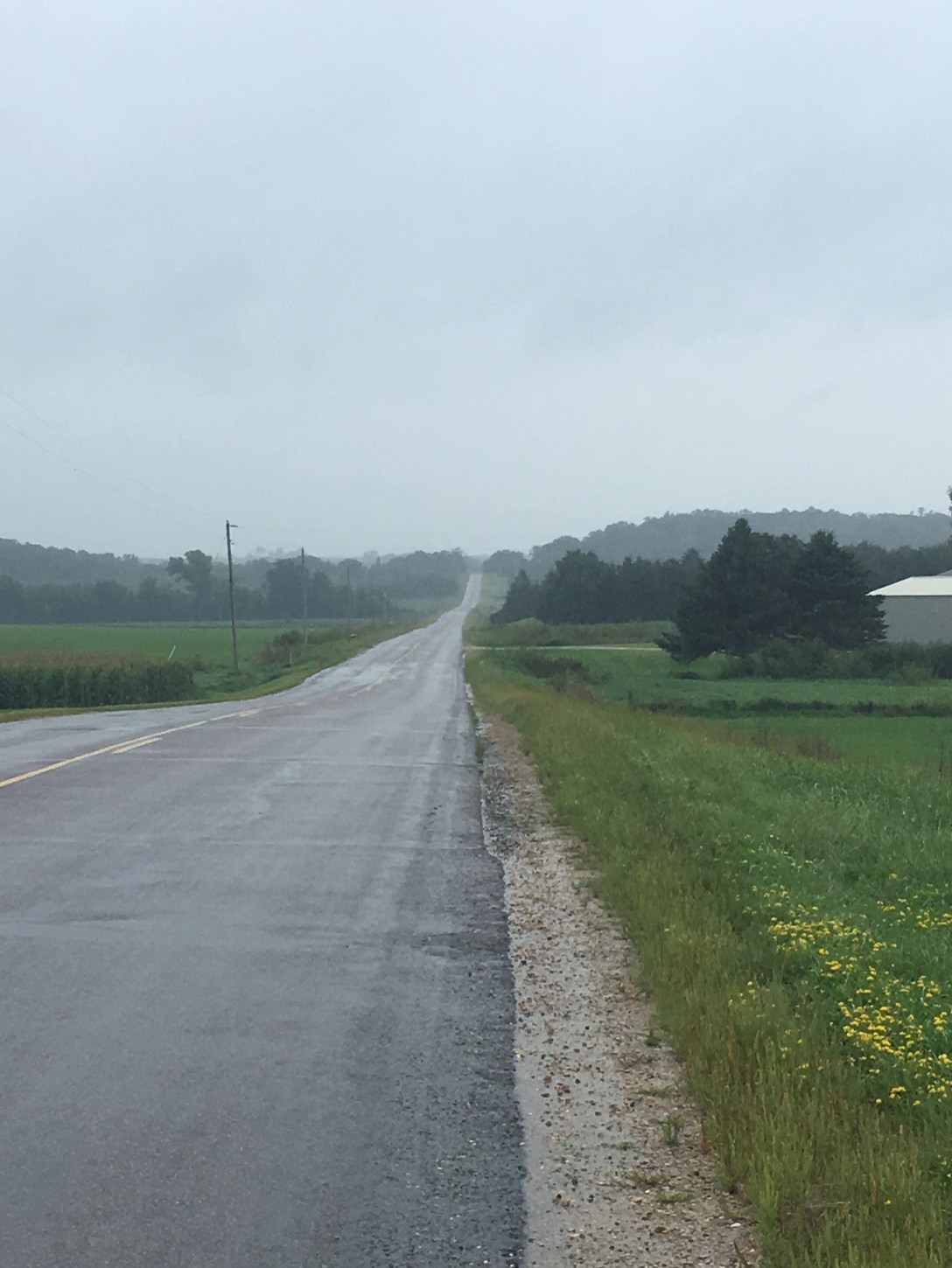 Radar showed a pretty big storm coming my way so I ate a slow breakfast and then packed slowly and then had another cup of coffee… Finally, I couldn’t wait any longer- I was antsy and the radar only showed green and light yellow- how bad could it be? After about a half hour of pleasant riding on slightly hilly county roads with little traffic, a light rain started falling. Not so bad. An hour into the ride I was soaked and it was raining steady- not super hard and not much wind- just a steady soaking rain. It wan’t that cold (in the 60’s) so I had my raincoat on but not my rainpants or shoe covers. The biggest problem was I couldn’t use my phone- for directions (I was off route) or for photos. When the phone is wet and my hands are wet, I can’t swipe the screen to get the phone unlocked or open. So I wasn’t exactly sure which little roads to take and I missed pretty landscape photos and a stunning photo opportunity of a silo with “Eat Good Cheese” on it in Wisconsin. I rode through rural neighborhoods and parks and really wasn’t sure which way to go at one particular intersection of county roads- the intersection of FF and V to be exact- when I saw a building down one road a short ways. It turned out to be a plant nursery with a cafe! I dried my phone and me off so I could use my phone, had lots of hot coffee and two pieces of pie while waiting out the storm for about an hour. What good fortune! When the rain diminished to a light drizzle, I took off again. As I got closer to the Mississsippi River the hills became larger and the landscape was very nice with large bluffs- the first rocks I had seen since western North Dakota- marking the edge of the valley. I rode into Red Wing about 2:30 and I’m now drying my shoes, gloves, etc. with the hair dryer. Thank goodness I had a very short ride today. Daily mileage: 37, trip miles: 2,138.