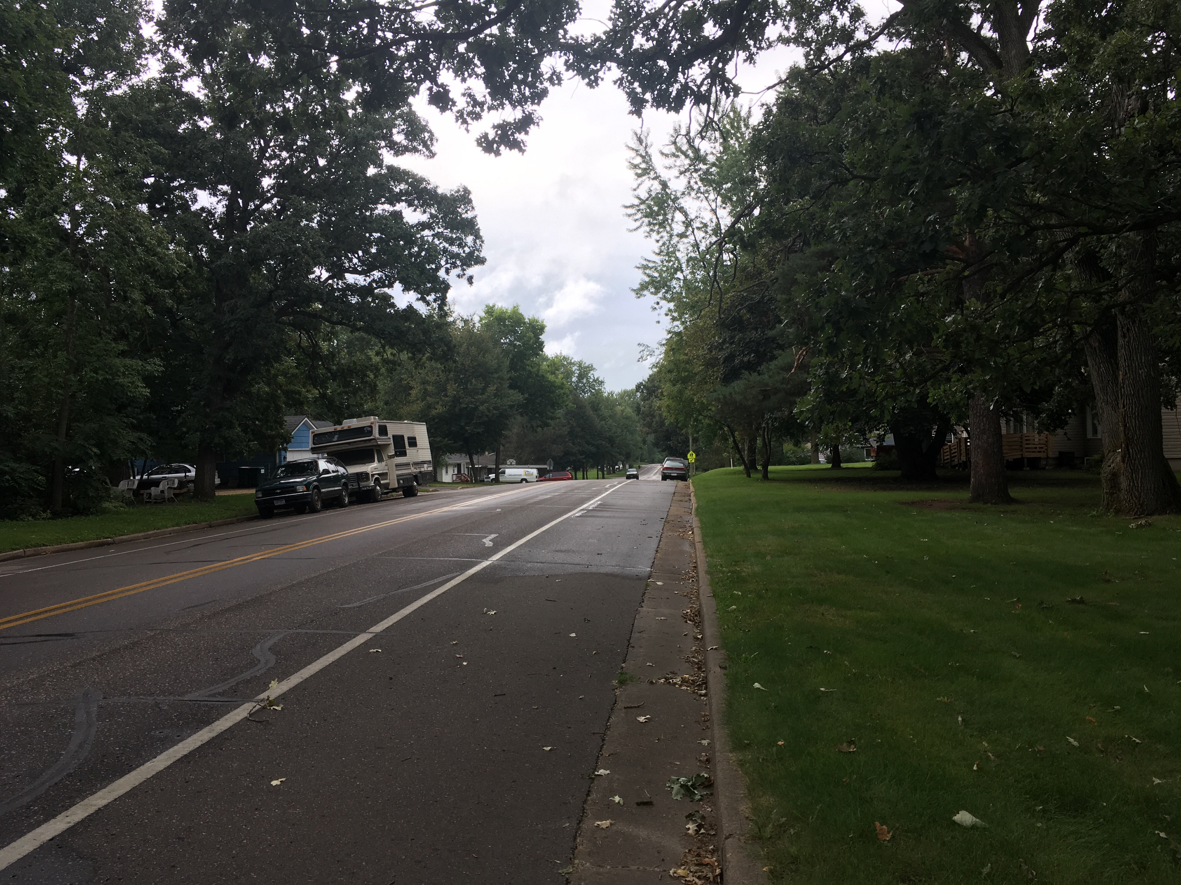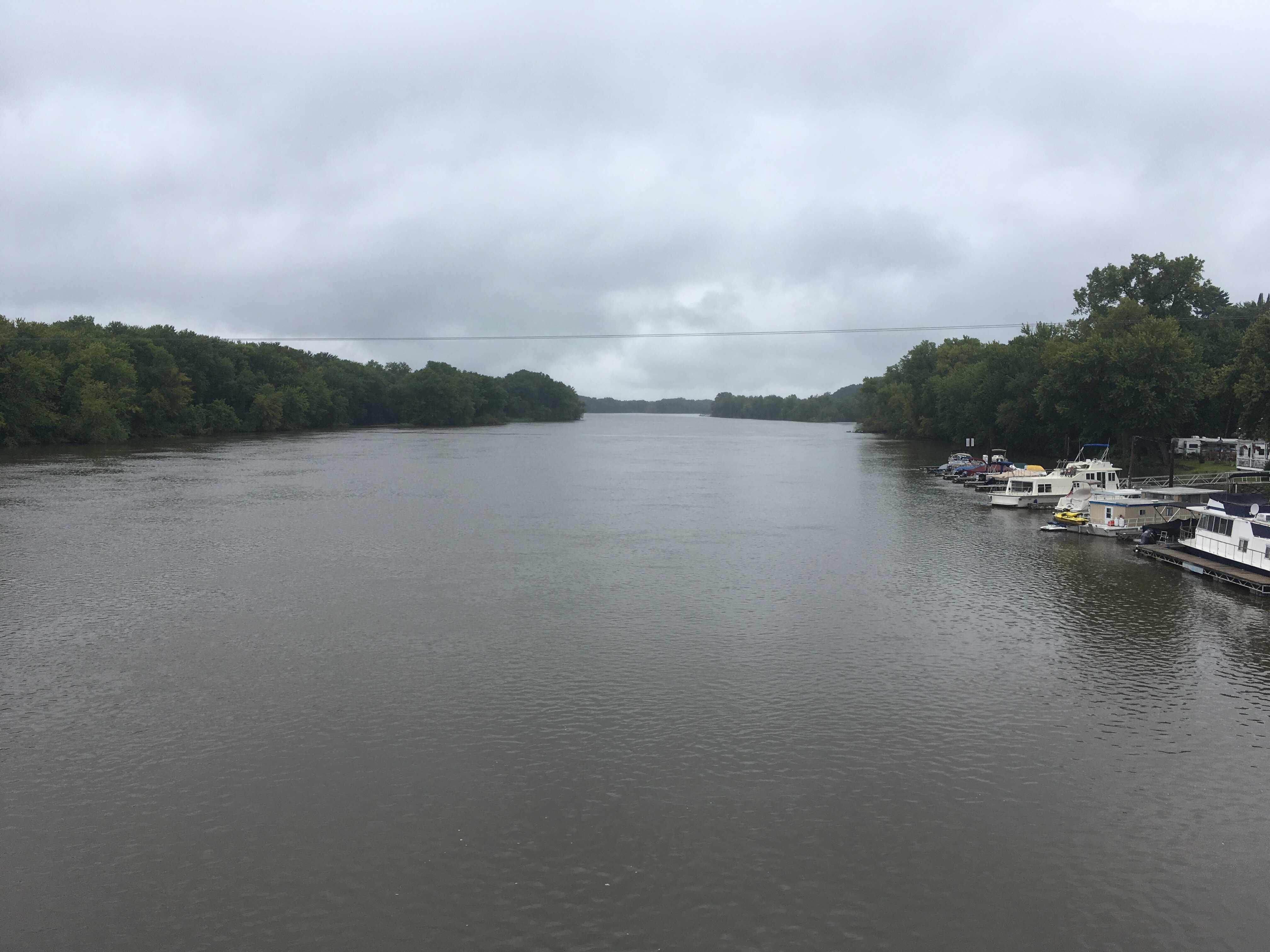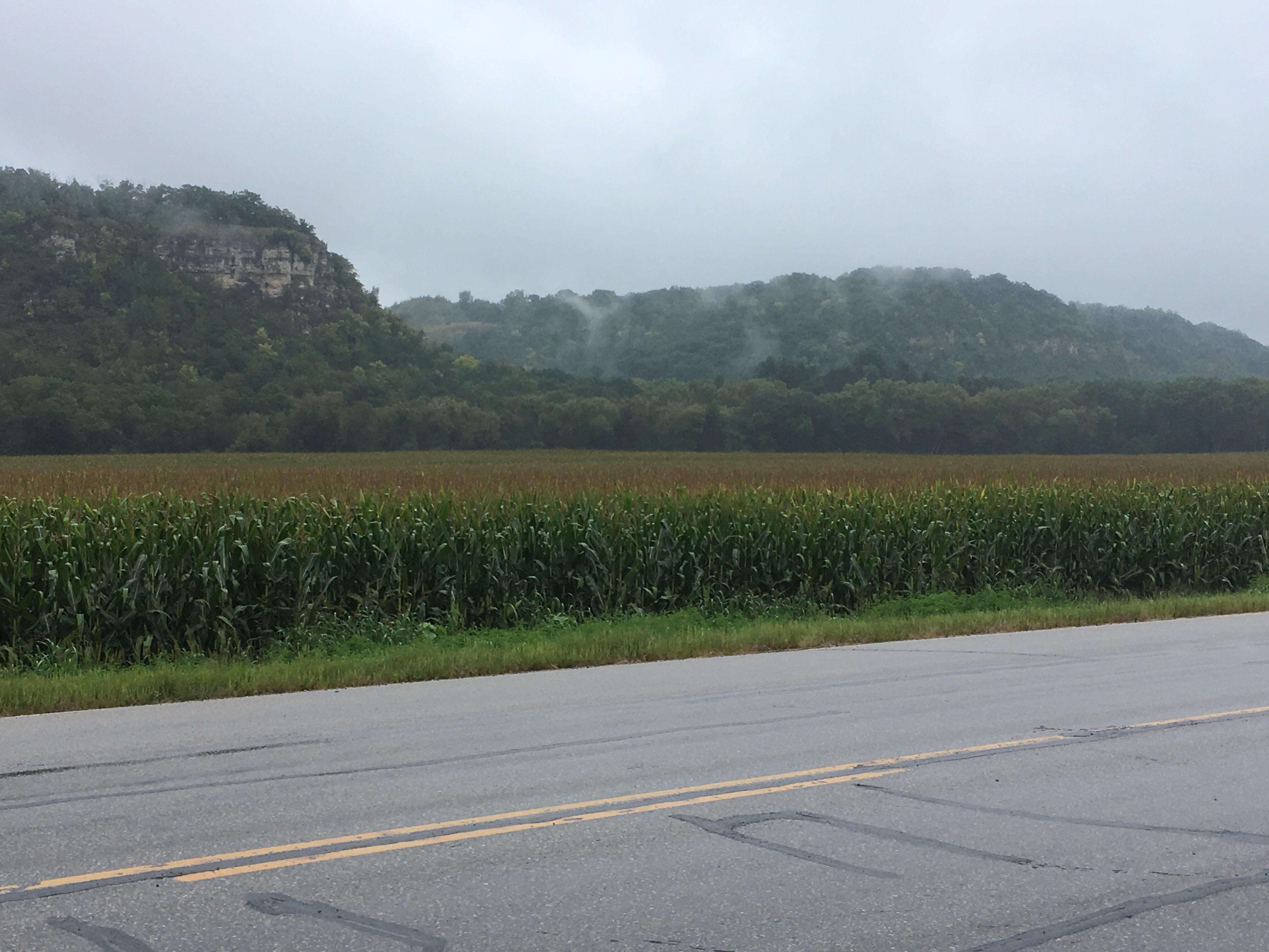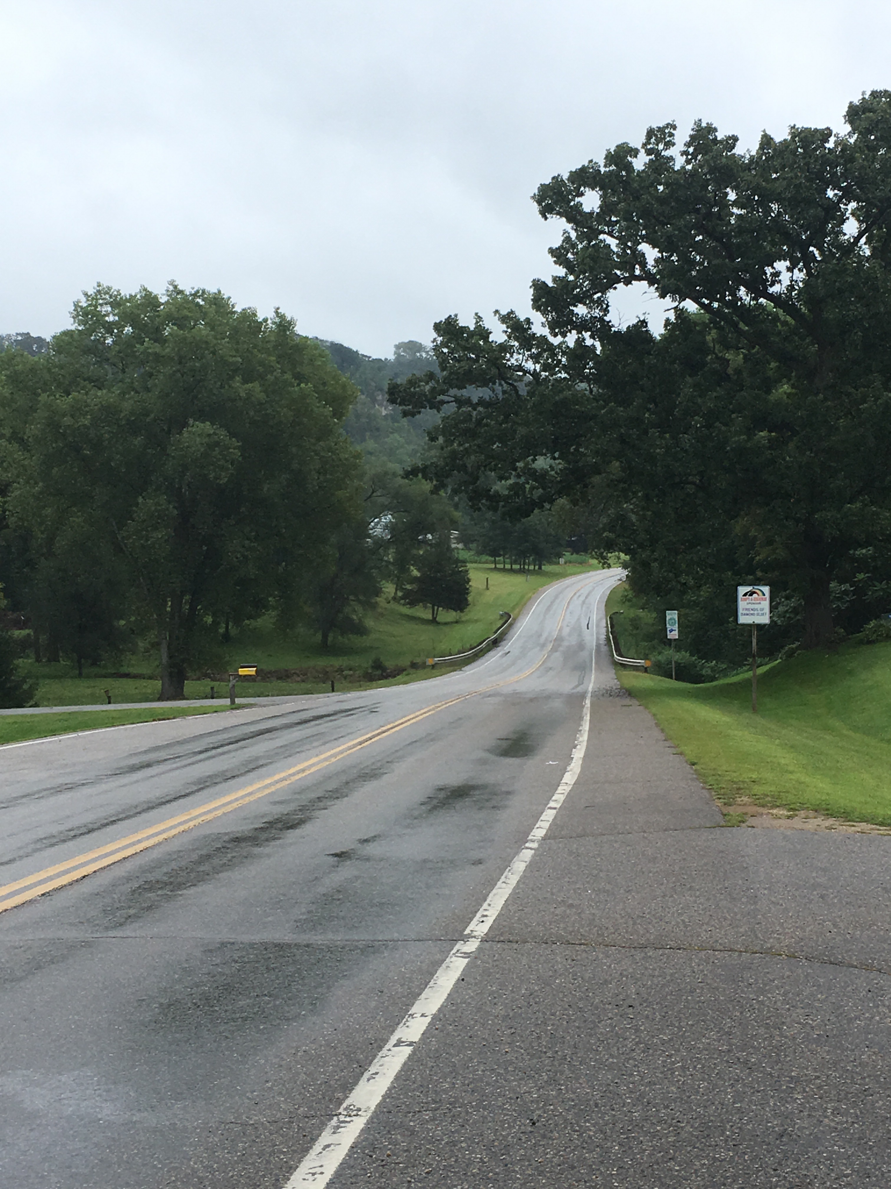 Radar showed a pretty big storm coming my way so I ate a slow breakfast and then packed slowly and then had another cup of coffee… Finally, I couldn’t wait any longer- I was antsy and the radar only showed green and light yellow- how bad could it be? After about a half hour of pleasant riding on slightly hilly county roads with little traffic, a light rain started falling. Not so bad. An hour into the ride I was soaked and it was raining steady- not super hard and not much wind- just a steady soaking rain. It wan’t that cold (in the 60’s) so I had my raincoat on but not my rainpants or shoe covers. The biggest problem was I couldn’t use my phone- for directions (I was off route) or for photos. When the phone is wet and my hands are wet, I can’t swipe the screen to get the phone unlocked or open. So I wasn’t exactly sure which little roads to take and I missed pretty landscape photos and a stunning photo opportunity of a silo with “Eat Good Cheese” on it in Wisconsin. I rode through rural neighborhoods and parks and really wasn’t sure which way to go at one particular intersection of county roads- the intersection of FF and V to be exact- when I saw a building down one road a short ways. It turned out to be a plant nursery with a cafe! I dried my phone and me off so I could use my phone, had lots of hot coffee and two pieces of pie while waiting out the storm for about an hour. What good fortune! When the rain diminished to a light drizzle, I took off again. As I got closer to the Mississsippi River the hills became larger and the landscape was very nice with large bluffs- the first rocks I had seen since western North Dakota- marking the edge of the valley. I rode into Red Wing about 2:30 and I’m now drying my shoes, gloves, etc. with the hair dryer. Thank goodness I had a very short ride today. Daily mileage: 37, trip miles: 2,138.