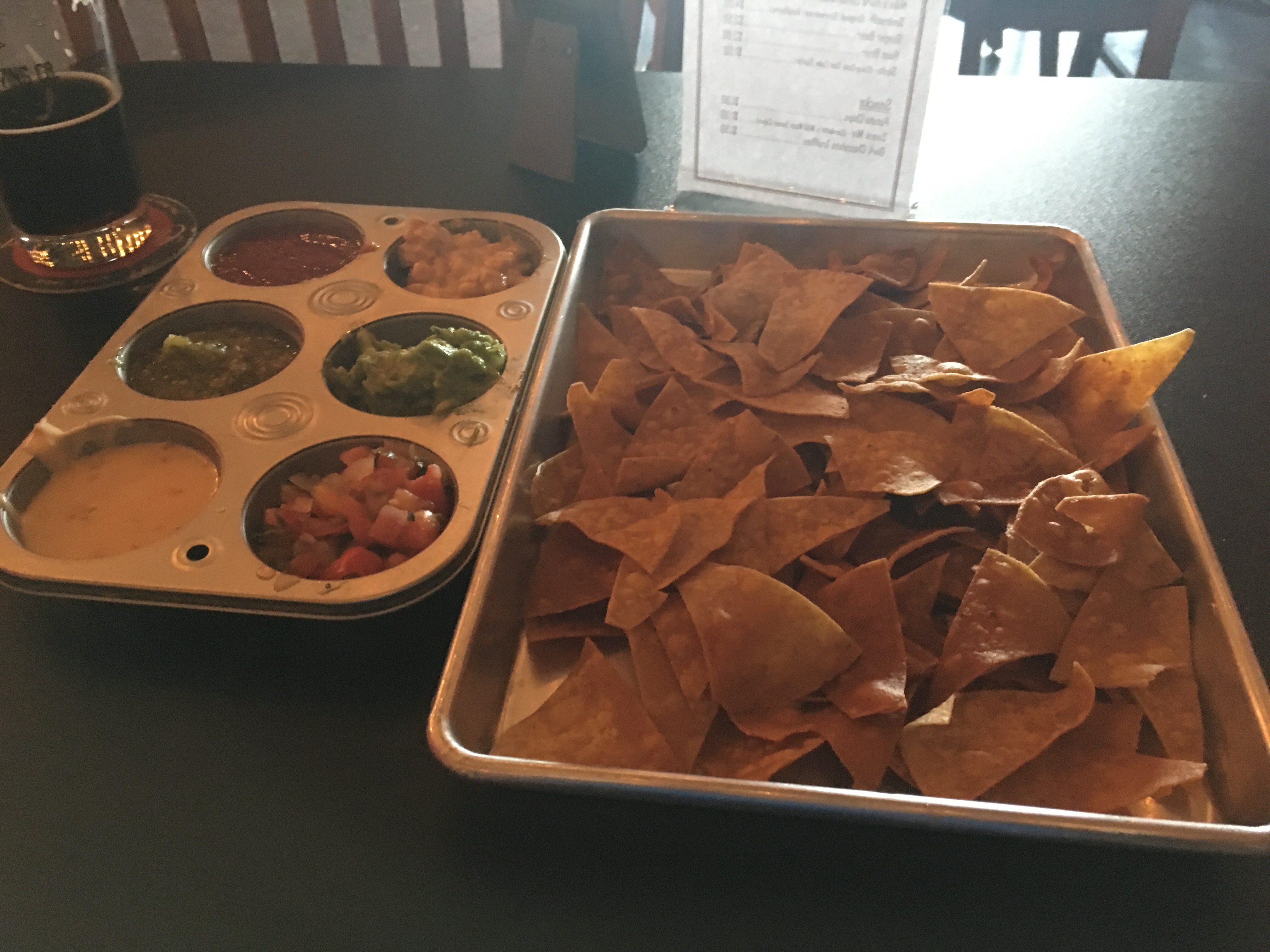 Finally, the Mexican restaurant, next door to the brewery, did a “chip flight” to go with your beer flight! What a great idea, chips with 4 different salsas, guac and queso- all served in a muffin tin!