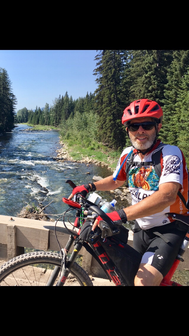John riding over the Elk River and the two of us in front of a mining truck in Sparwood: