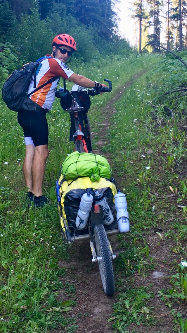 We left our campsite in Elkford around 07:30 to get breakfast in a pizzeria. After a very hearty breakfast we hit the road and it turned out to be paved for about 1/4 mile then singletrack with hairpin curves and very steep slopes. It was hard, exciting and dangerous if you happened to be towing a trailer… OSHA would definitely not allow trailers on such trails in the US! We covered 1.4 miles in the first 45 minutes or so- at that rate it was going to take us exactly 24 hours to reach our planned destination of Fernie, about 45 miles away. We eventually got on some old logging roads and really started picking up speed. Oh yeah, we also rode into a 20+ mph wind ALL DAY. We made it to Sparwood for a late lunch and there decided to forgo more singletracks to get to our hostel in Fernie 20-25 miles away, at a reasonable time. Again, beautiful scenery and some fun, challenging riding. The Bobs do great on any kind of road but singltracks, especially with tight turns, are just not very rideable for us…As promised, John’s trail name is Johnny D, aka Johnny pisco. I go by Buck Steele. Daily totals: 45 miles and almost 2,000′ of climbing- all in the morning.