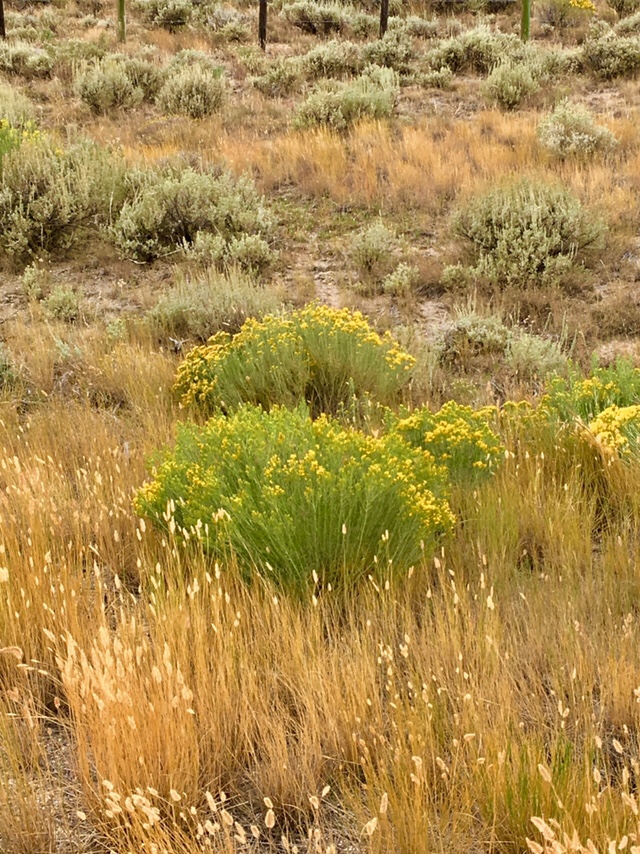 The landscape is much drier here- vegetation is grasses, pretty yellow flowers and sage: