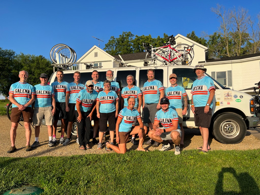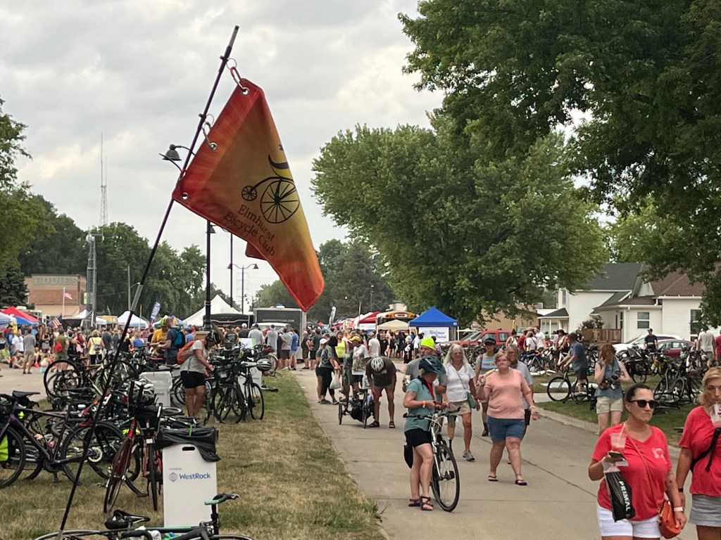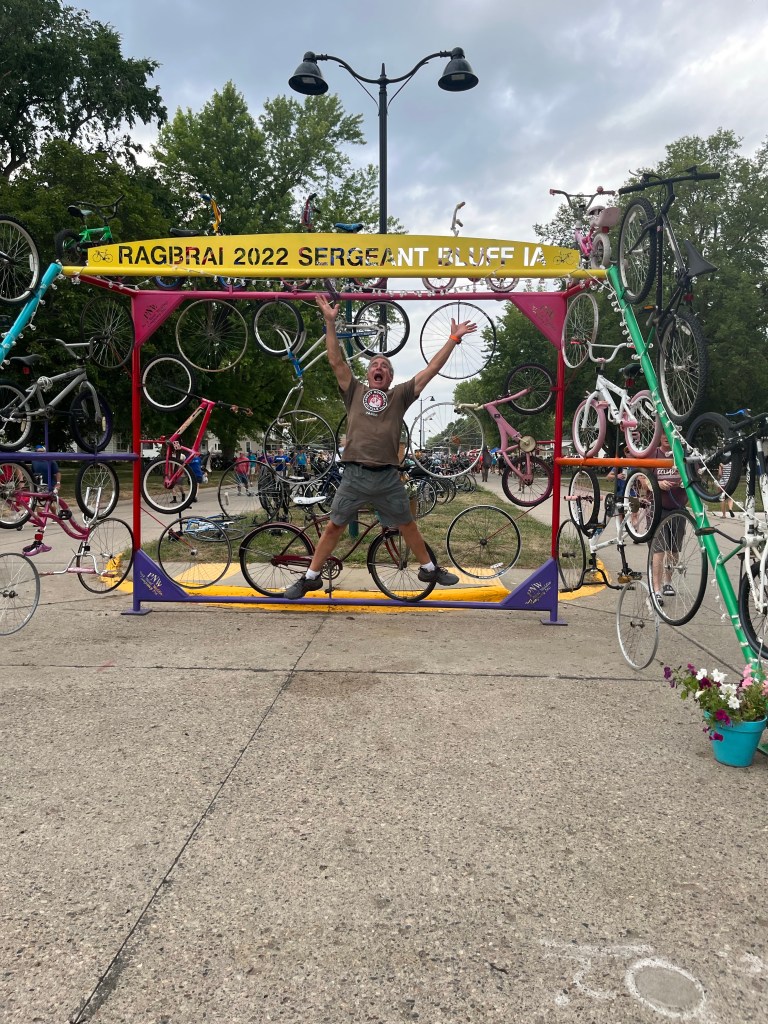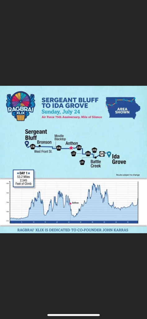 At 07:00, nine of us (and our gear and bikes), and the driver, packed into the GOATS van for the 5 hour drive to Sergeant Bluff. All along the way we were passed by trucks, cars and vans with bicycles in carriers. It looks like all of Iowa and most of the surrounding states are mobilizing for RAGBRAI. While our driving route to Sergeant Bluff is south of where we will be riding, it clearly indicates that this will be an epic rolling 7 day RASCAL (Riding around Soybeans, Corn and Lakes) ride. We just stopped for gas and I ate 2 huge snickerdoodle cookies and two huge peanut butter cookies. I’m starting to get excited…. For a variety of reasons I didn’t train nearly as much as I would have liked to for this hot, long, hilly ride. But, as brother Ken said “it should be a piece of cake, it’s only one state”. And anyone could do this if they trained enough and had a proper diet, etc. but it takes a real athlete to perform under these adverse conditions. There are 12,000+ people camping out all over Sergeant Bluff- population 4,900 . It took us a while to find our camp area to set up our tents (the +/- 12 Galena Goats camp with the +/- 100 Siouxland Cyclist’s). We have an organizational meeting with Siouxland in one hour then head to the Expo where various food, beverage and equipment vendors will be set up. We had a spaghetti dinner at a middle school that was a fundraiser for the dance team.