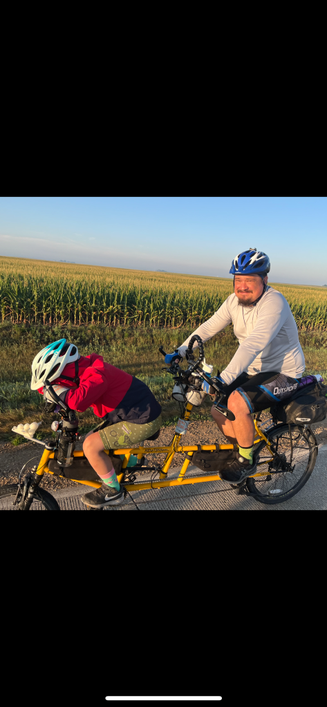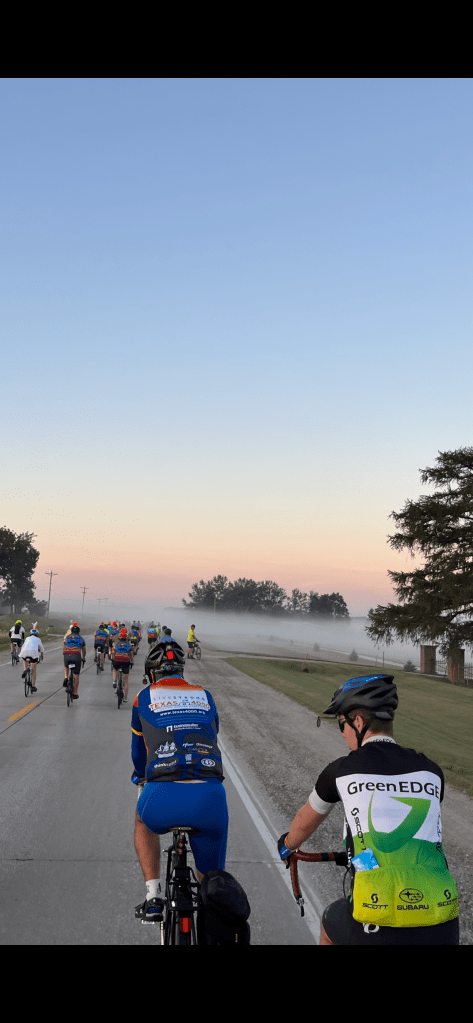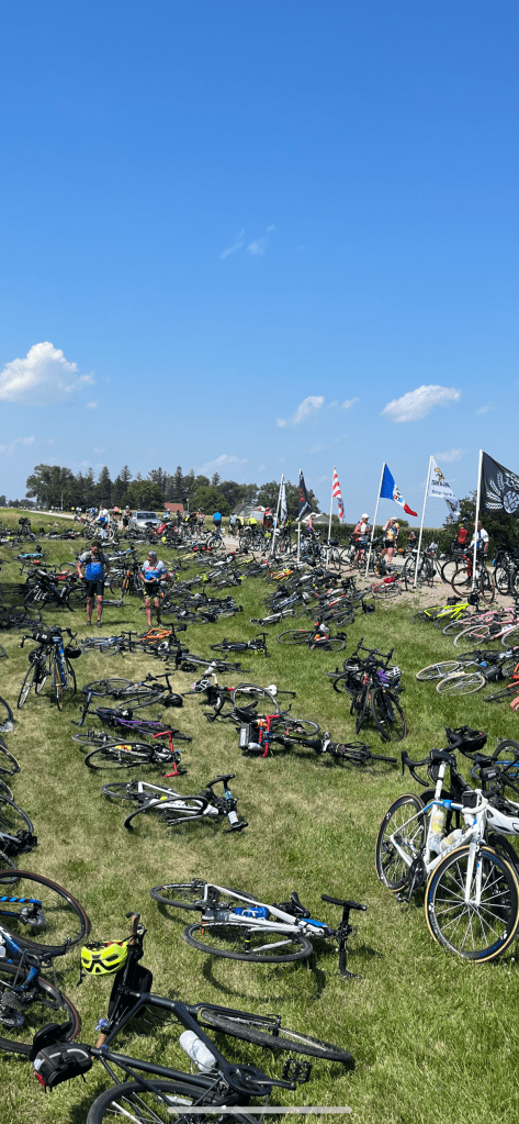 We left at close to 6:00 this morning and it was beautiful! Cool, a little foggy and a very light breeze. We (Fred & I) stopped in every pass through town and had beverages in every one of them. And food in sone of them. I tell you, vodka and lemonade is a refreshing summer drink. It was a warm day but the wind wasnβt bad and we averaged over 16 mph for the 104 mile ride. I also got myself a stunning βride Iowaβ outfit for my birthday- Iβll post a photo of it tomorrow. One of the things I really enjoy is meeting and talking to people on the ride. RAGBRAI gives us a sort of license plate we can put behind our bike seat- you put your name and where you are from on it. I can then address riders by their name when I pass them. I try to encourage older riders and riders that seem like they are struggling a bit but I say hi to almost everyone.
